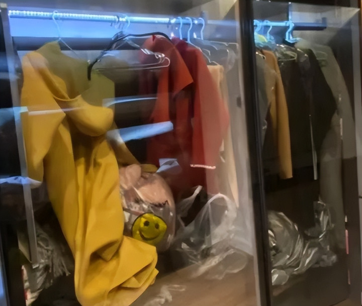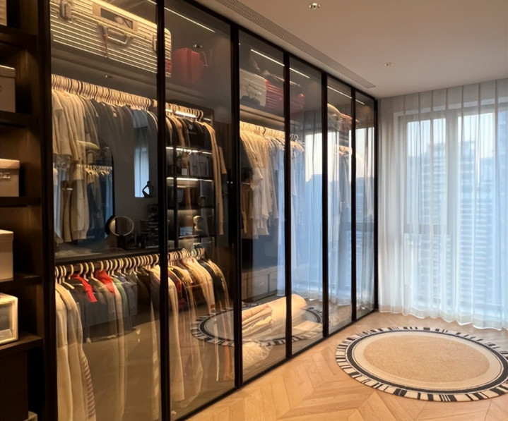 不得不说,玻璃衣柜在颜值上的确很高级,但你在不用的时候还可以,只要是后期你悬挂上衣服就完全不一样了。